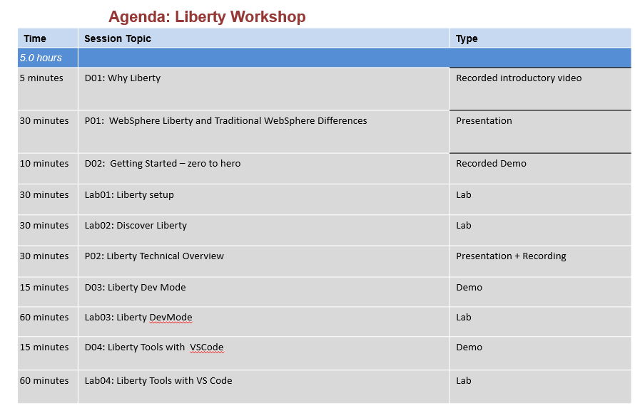 At the end of this workshop, the attendee will learn how to install Liberty, understand Liberty concepts, use Liberty in common IDE’s, Dev Mode, in containers, and from the command line.