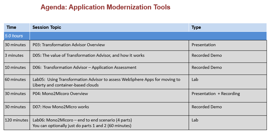 Attendees also gain experience using Transformation Advisor during the Java application assessment phase of application modernization journey to Liberty and container-based clouds.
